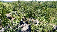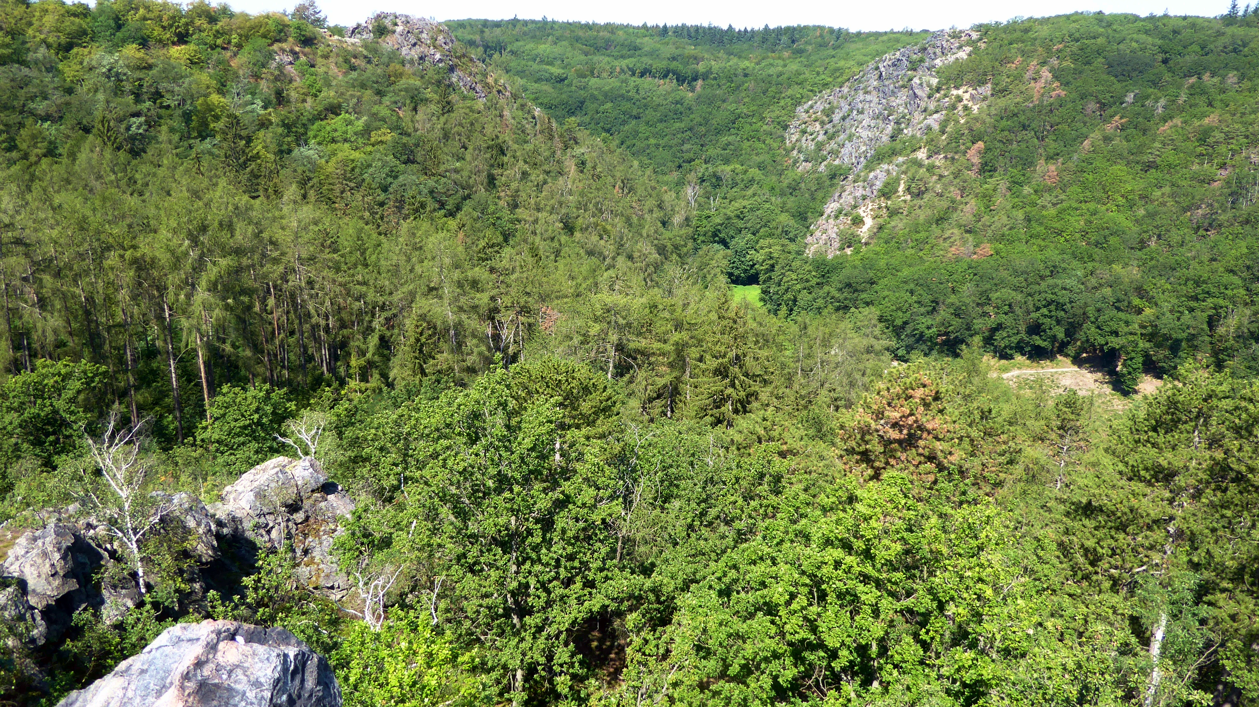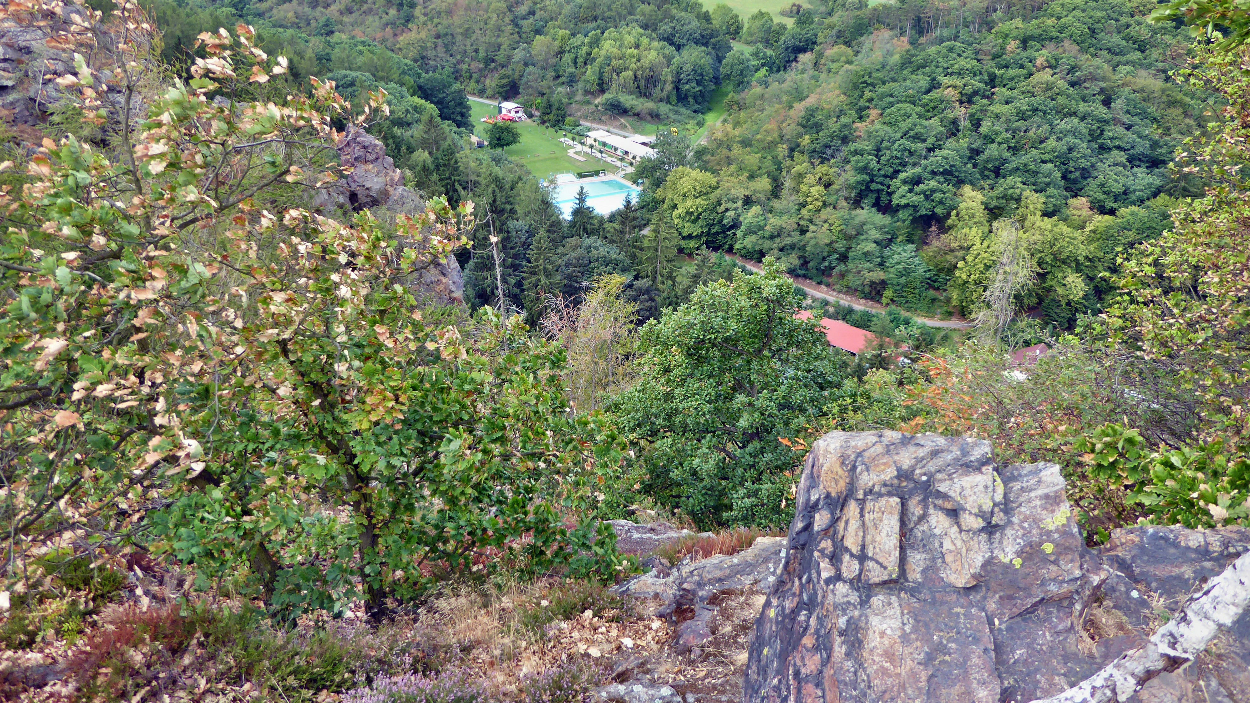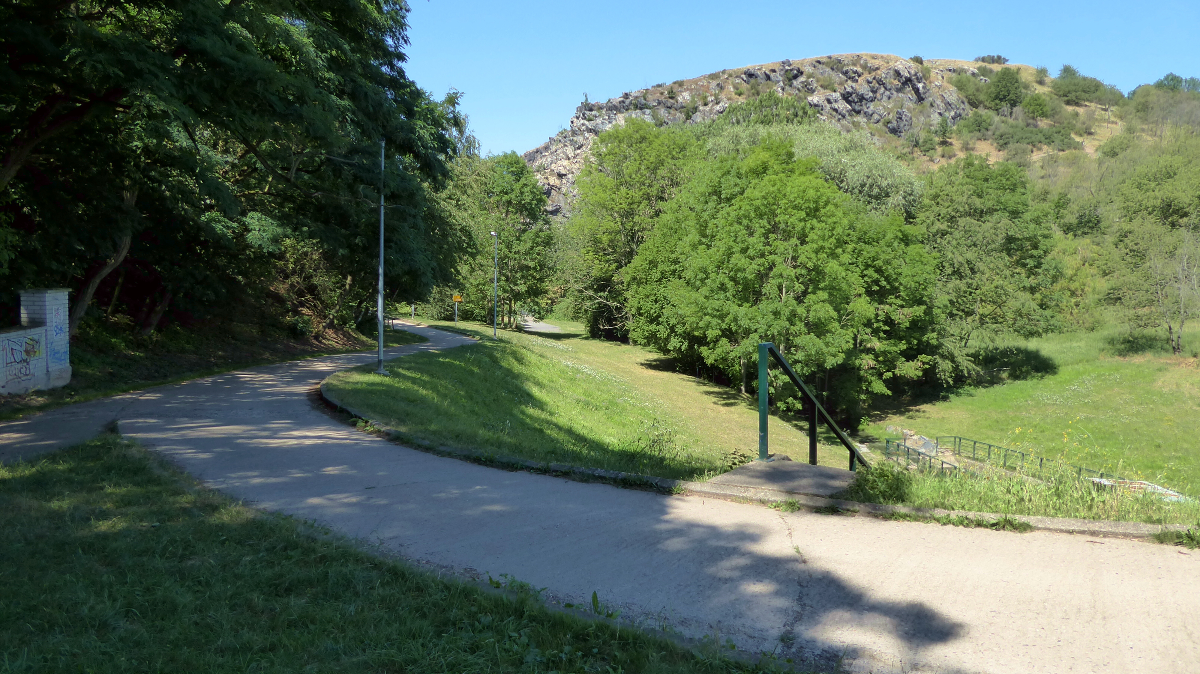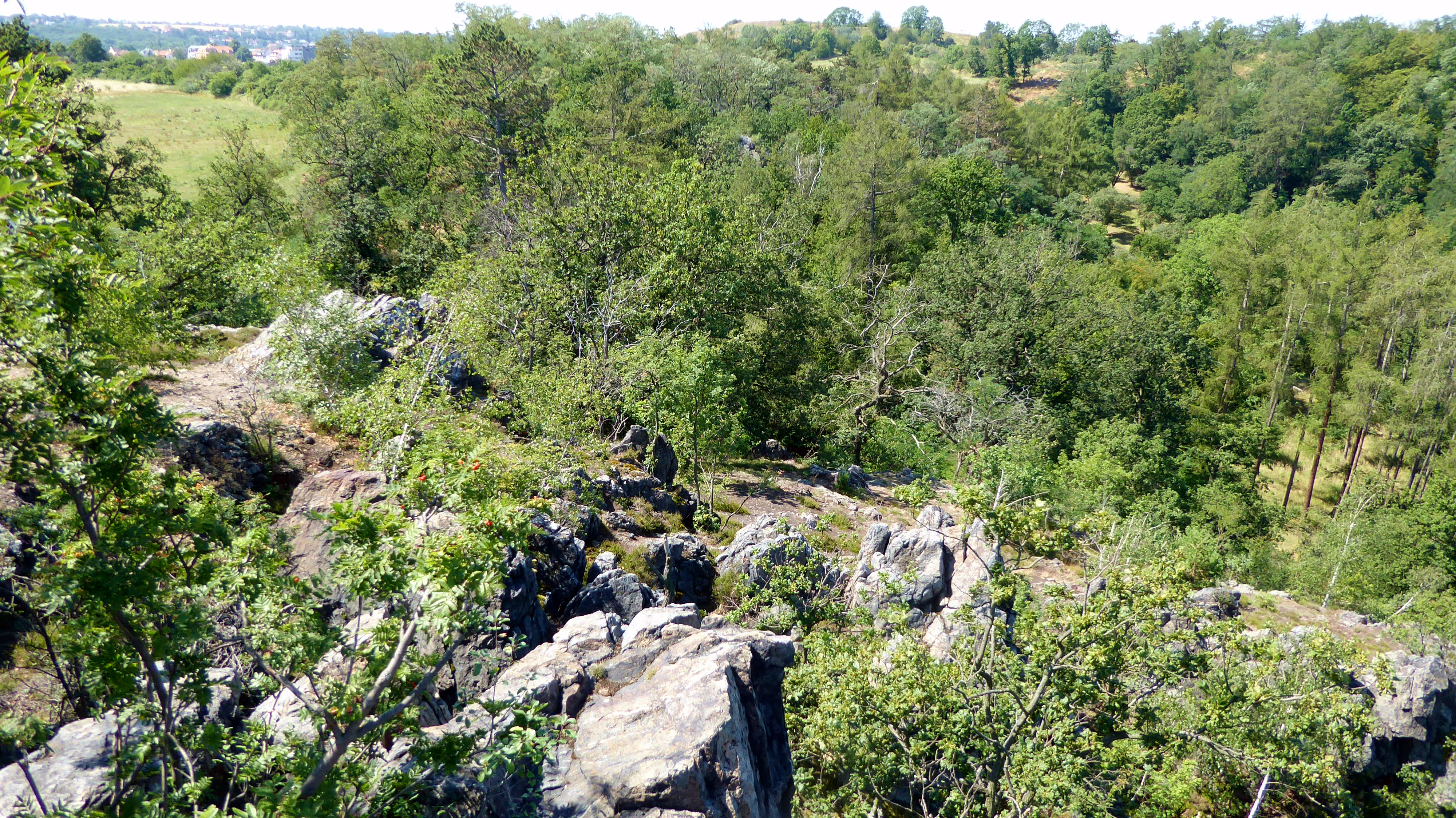 Nach dem Camping wird der Spaziergang abenteuerlicher. Es besteht die Möglichkeit vorsichtig auf die Felsen zu steigen (kein Klettern) und die Aussicht in die Schlucht und das Tal oder zum Stadtteil Liboc und darüber hinaus bis zum Gehege und Schlößchen Hvězda (Stern) zu genießen.