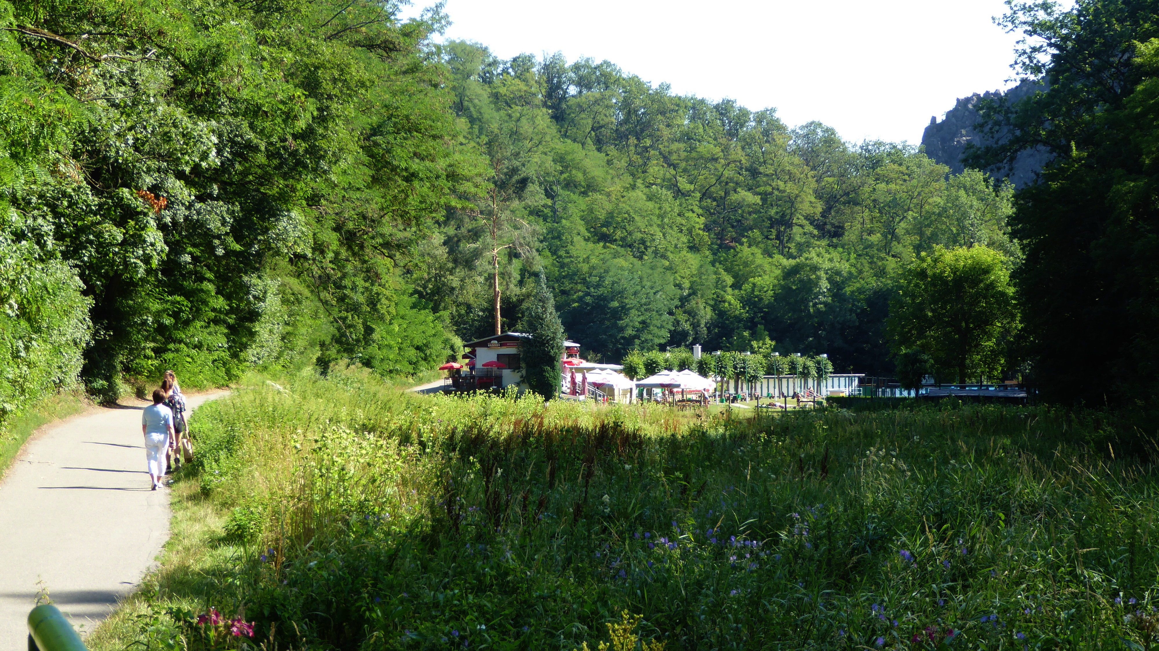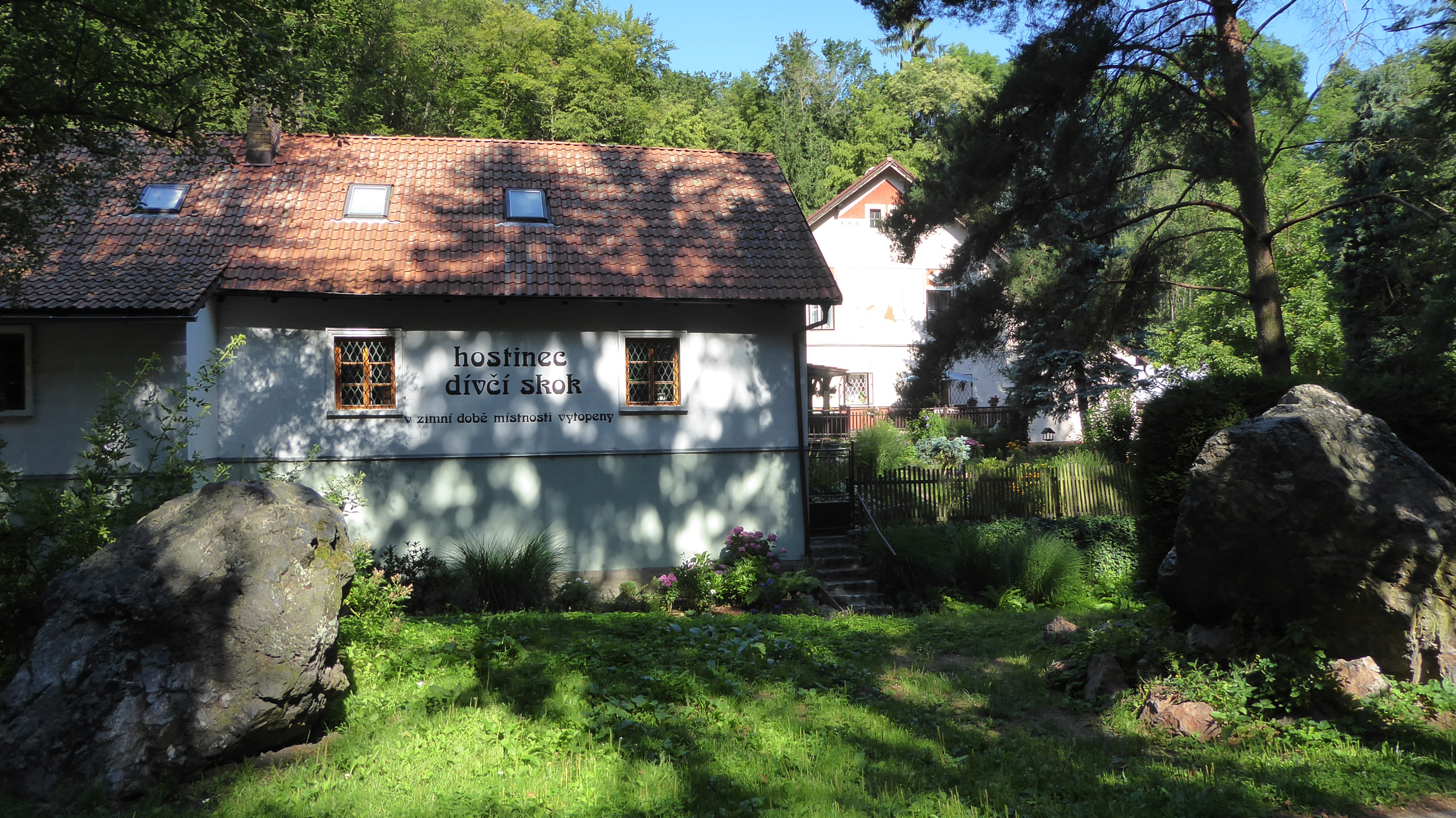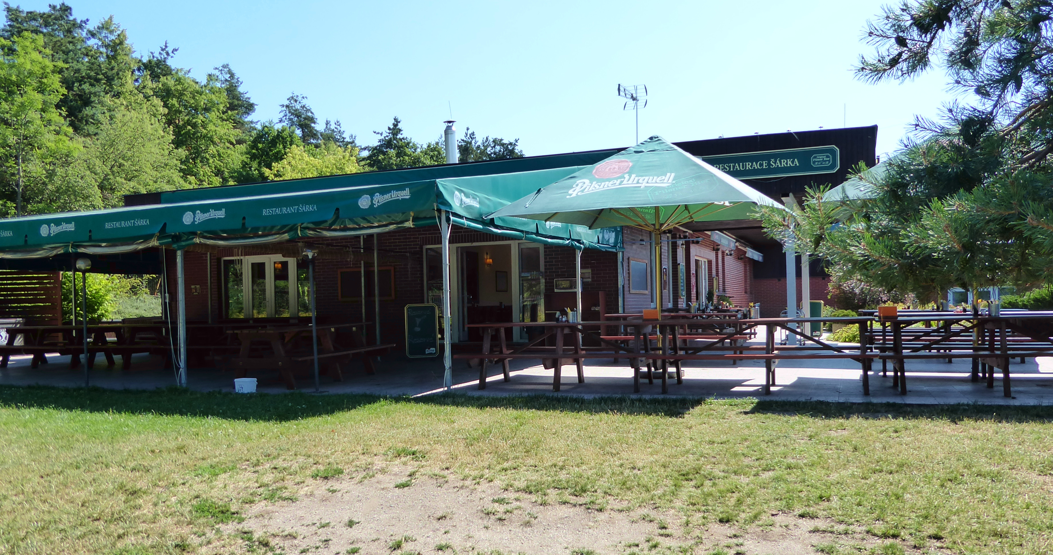 Wir überqueren den Weg auf der Rückseite von McDonald und steigen ein paar verwitterten Steinstufen herunter und gehen gemütlich am Bach entlang in der Schlucht zwischen den Felsen bis zum Freibad Divoká Šárka. Hier können wir einen Badeaufenthalt einlegen, wenn das bekannt kalte Wasser nicht stört, oder einfach nur sonnen. In der Nähe befindet sich auch ein Gartenrestaurant Dívčí Skok (Mädchensprung) unterhalb des Felsens, von dem sich Šárka in die Tiefe hat stürzen sollen.