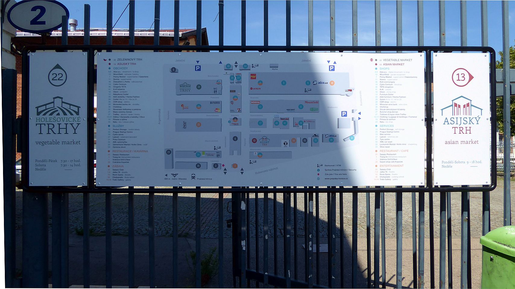 Nach der Inbetriebnahme der Štvanice-Fußgängerbrücke im Sommer 2023 kann man die Markthallen auch zu Fuß bzw. mit dem Fahrrad von der Insel Štvanice oder sogar vom Stadtteil Karlín am anderen Moldau-Ufer erreichen.